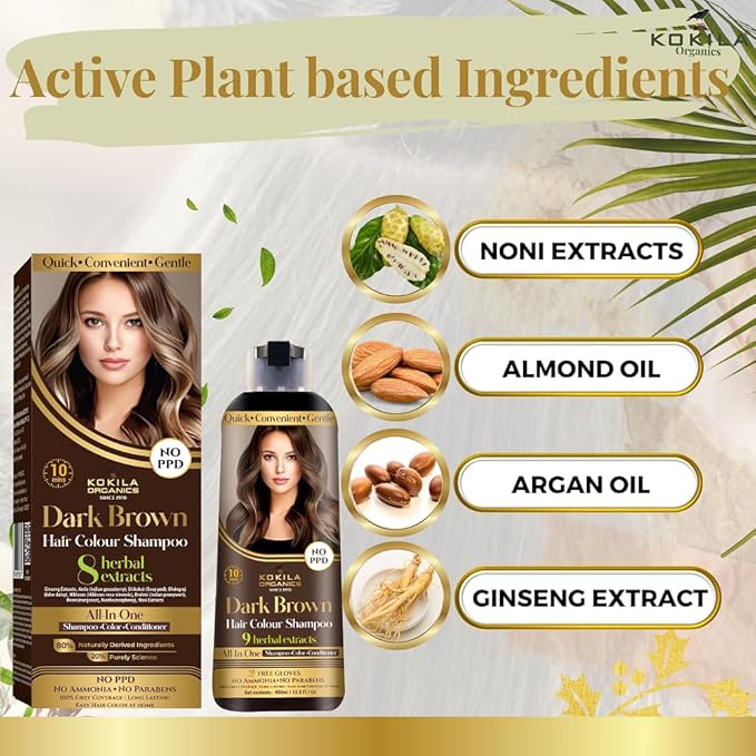 Wet your hair towel dry and wear the free gloves provided with Kokila No PPD Colour Shampoo. Please ensure your hair is without any oil or Dust ES. Pump out the required quantity of Shampoo onto your palm 2 different shampoos will come out together , mix them well. Apply on wet hair and massage well for about a minute covering the roots and all grey areas until shampoo is evenly spread into hair.Leave it on hair for about 10-12 minute (for even darker shade keep it for 16-17 minutes ) Gently wash your hair till water runs clear